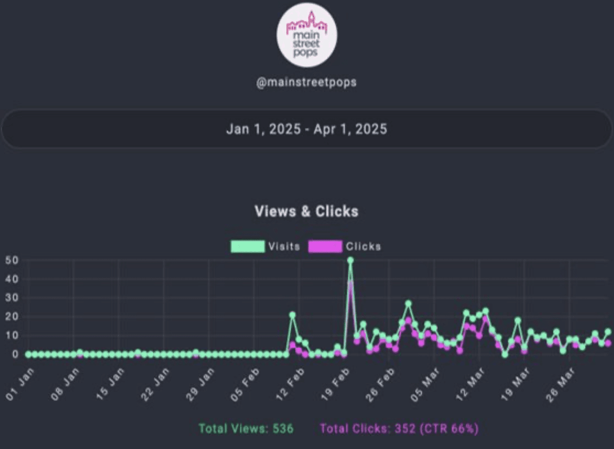 536 total views and 352 total clicks achieving 66% CTR (Jan-Apr 2025)